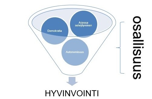 Osallisuus on keskeinen hyvinvoinnin lähde. Hyvinvointi koostuu toimintamahdollisuuksista, jotka voi nähdä vapautena. Nussbaumin (2011) mukaan toimintamahdollisuudet ovat niitä, jotka ihminen välttämättä tarvitsee, jotta voisi elää laadukasta ja elämisen arvoista elämää. Ihmisen perusvapaus on vapaus valita olemisensa. Toisin sanoen toimintamahdollisuudet määrittävät mitä yksilö kykenee tehdä tai olla elämänsä aikana. (Nussbaum 2011: 18-20.) Ben Bradley (2015) esittää, että nämä toimintamahdollisuudet ovat tärkeitä lähteitä hyvinvointiin. Hyvinvoinnilla on siis rakenneosat, jotka ovat luontaisesti hyviä ihmisille. (Bradley 2015: 15.) Tärkeä kysymys kehitysvammaisten osallisuutta määritellessä on se, mitkä ovat ne rakenneosat, jotka lisäävät asiakkaiden hyvinvointia?
