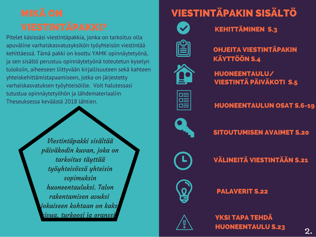Artikkeli perustuu opinnäytetyöhön: Kauppinen, Jelena – Solansuu, Suvi 2017: Työyhteisön viestinnän kehittäminen varhaiskasvatusyksikössä. Metropolia ammattikorkeakoulu, sosionomi, ylempi AMK. Ammattikorkeakoulujen opinnäytetyöt löytyvät www.theseus.fi tietokannasta (ao.ammattikorkeakoulu ja ao.tutkinto).