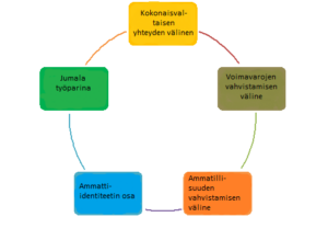 Olen kuvannut opinnäytetyöni tulokset kehänä, joka sisältää viisi elementtiä, jotka ovat sidoksissa toisiinsa. Olen nimennyt kehän rukouskehäksi (kuvio 1). Kokonaisvaltainen yhteyden väline kuvaa perheneuvojien ilmaisemaa rukouksen jatkuvaan mielentilan ja hengitykseen vertautuvaa yhteyttä Jumalaan. Rukous on myös voimavarojen vahvistamisen väline. Rukouksesta ja rukouksessa saadaan apua, tukea, turvaa, huolenpitoa, rohkaisua, kannattelua, ohjausta, viisautta, iloa ja toivoa. Rukous nähtiin myös ammatillisuuden vahvistamisen välineenä. Rukouksella nähtiin olevan merkitystä ja vaikutusta omaan työhön niin vuorovaikutus-, kohtaamis-, kuin läsnäolotaitojenkin osalta.  Rukous oli vastaajille keskeinen osa omaa persoonaa ja omaa ammatti-identiteettiä sekä perheneuvojan työtä. Perheneuvojat ilmaisivat monin eri tavoin kokevansa Jumalan läsnäolon ja avun sekä ohjauksen osana työtään ja kohtaamisissa. Jumala koettiin ikään kuin työparina.